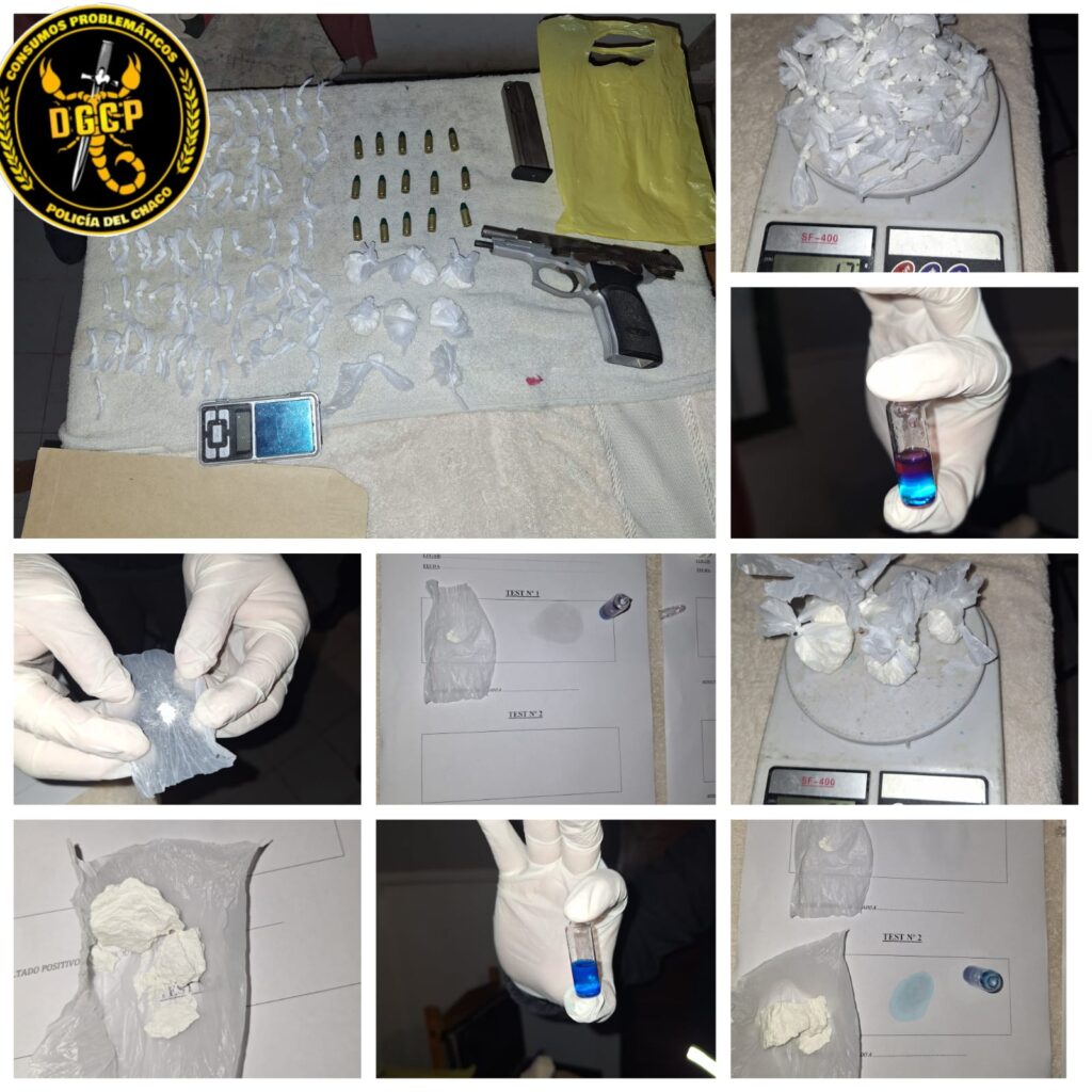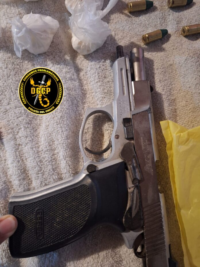 Además de la droga, los uniformados incautaron una balanza de precisión y una pistola 9mm marca Bersa Thunder con su cargador y 15 cartuchos sin percutar. Al verificar la numeración del arma, se determinó que la misma poseía un pedido de secuestro vigente desde la localidad de Villa Ángela.