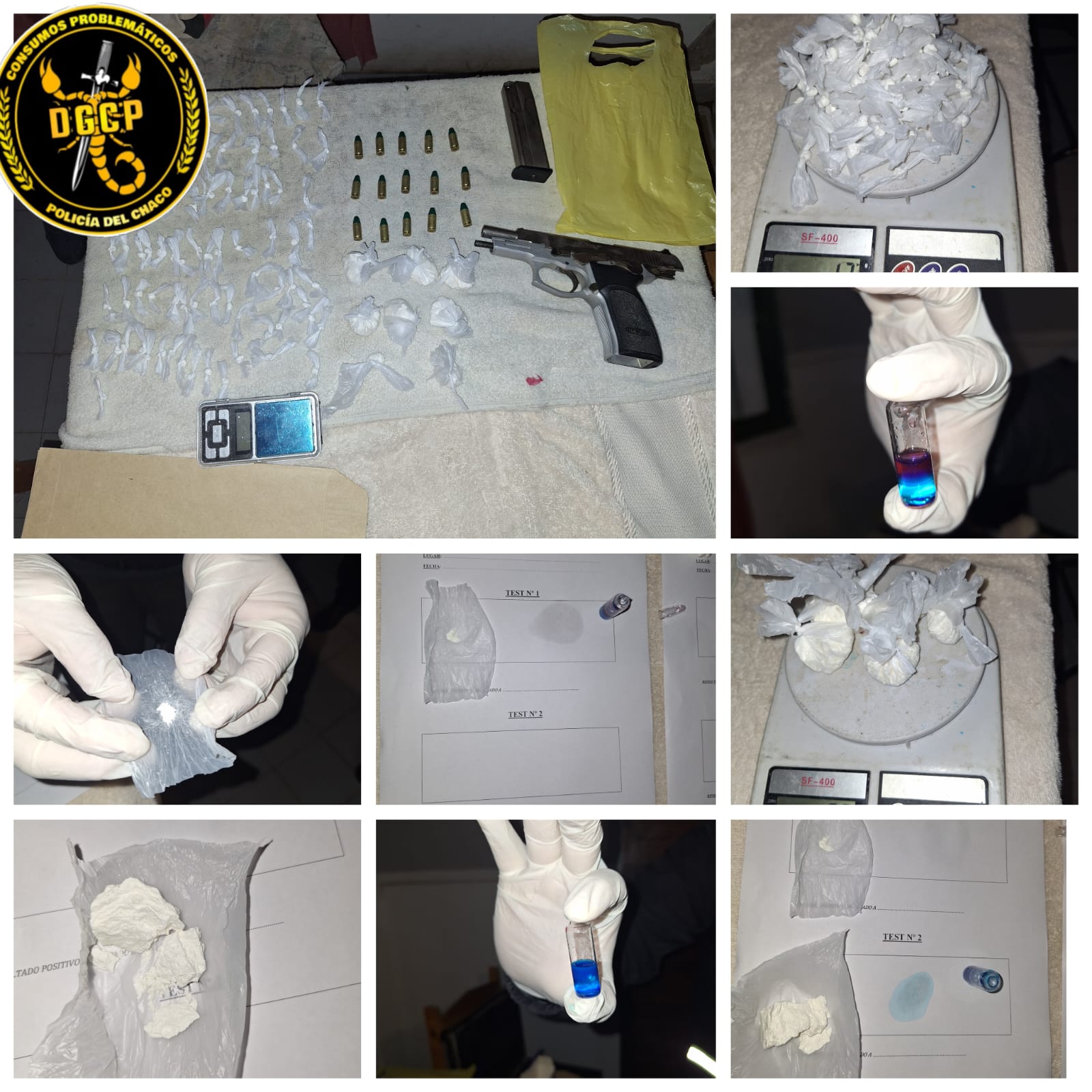 Ante esta situación, se dio intervención al personal de la División Operaciones Metropolitana de la Dirección General de Consumos Problemáticos. Los especialistas realizaron las pruebas de campo correspondientes sobre varios envoltorios hallados en el lugar, los cuales arrojaron un resultado positivo para cocaína, con un peso total de 80 gramos distribuidos en 85 dosis individuales y 8 envoltorios de mayor tamaño.