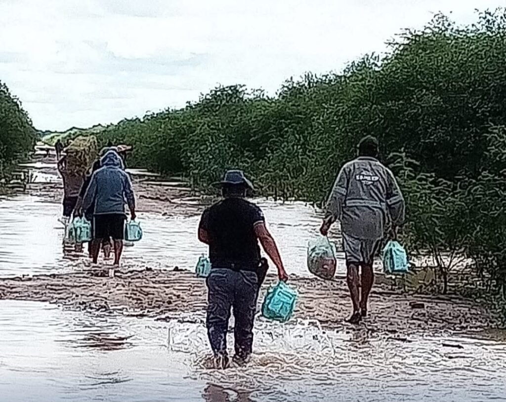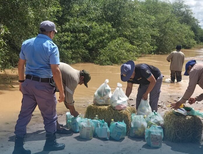 Efectivos de la Policía del Chaco mantienen un operativo constante en la localidad de Wichí El Pintado, brindando asistencia y acompañamiento a las familias que se encuentran aisladas debido a la crecida del río Bermejo.