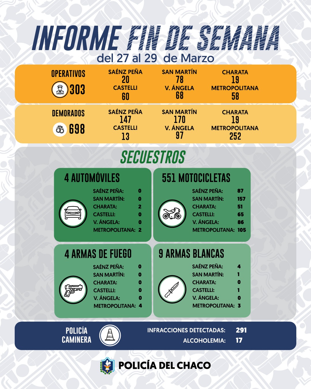 - Área Metropolitana de Resistencia: Se realizaron 58 operativos, resultando en 252 demorados, 105 motocicletas incautadas, 3 armas blancas, 4 armas de fuego y 2 automóviles secuestrados.