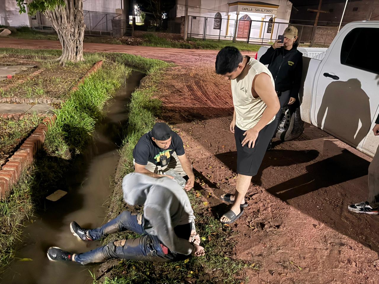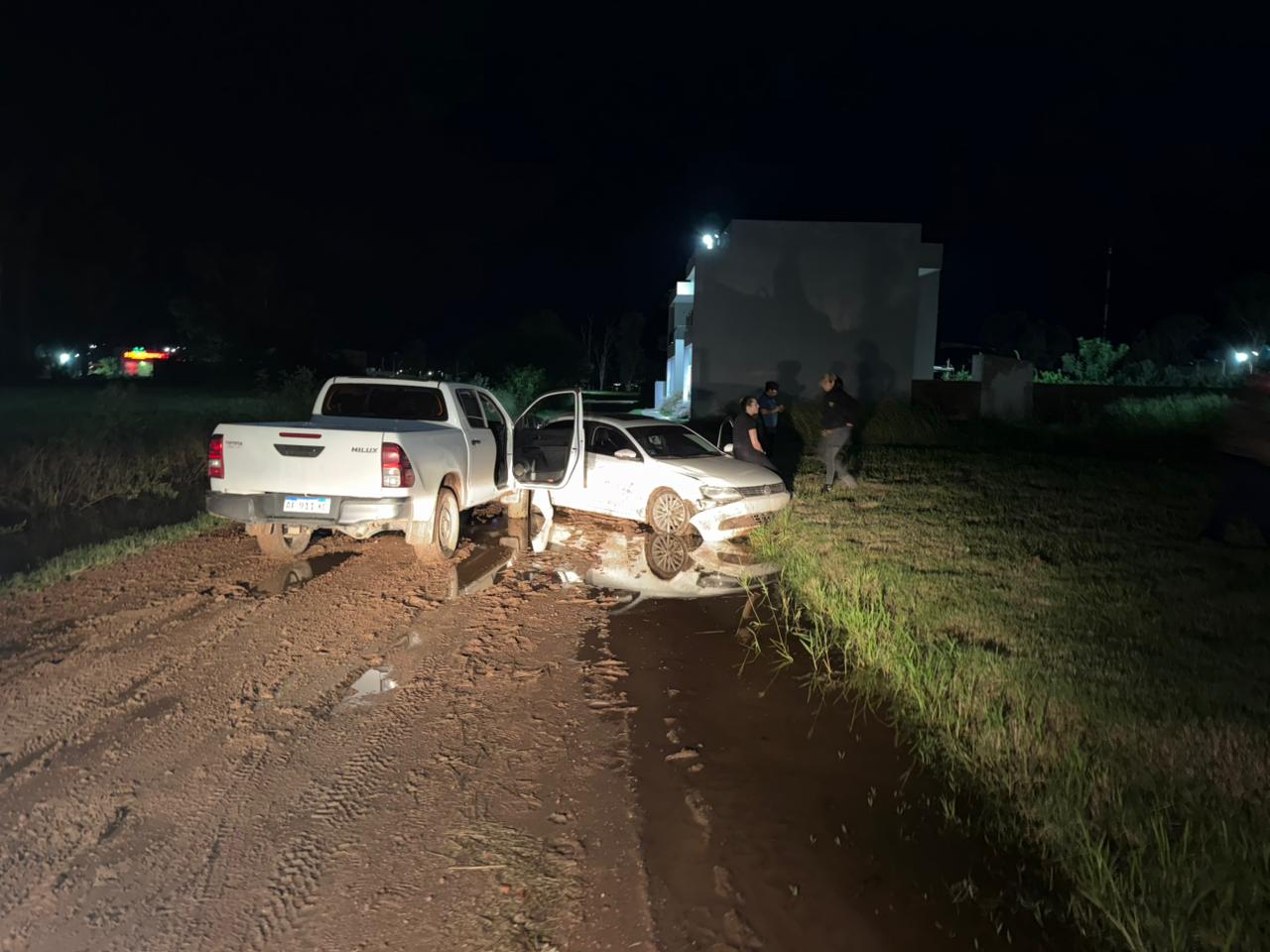 Alrededor de las 21:00 horas, el rodado investigado —un Volkswagen Vento color blanco— fue divisado por el personal policial. Al notar la presencia de los uniformados, los ocupantes del automóvil intentaron esquivar el control, lo que provocó una colisión contra un móvil policial. Debido a las condiciones climáticas y la maniobra evasiva, el auto de los sospechosos terminó incrustado en una banquina con agua.