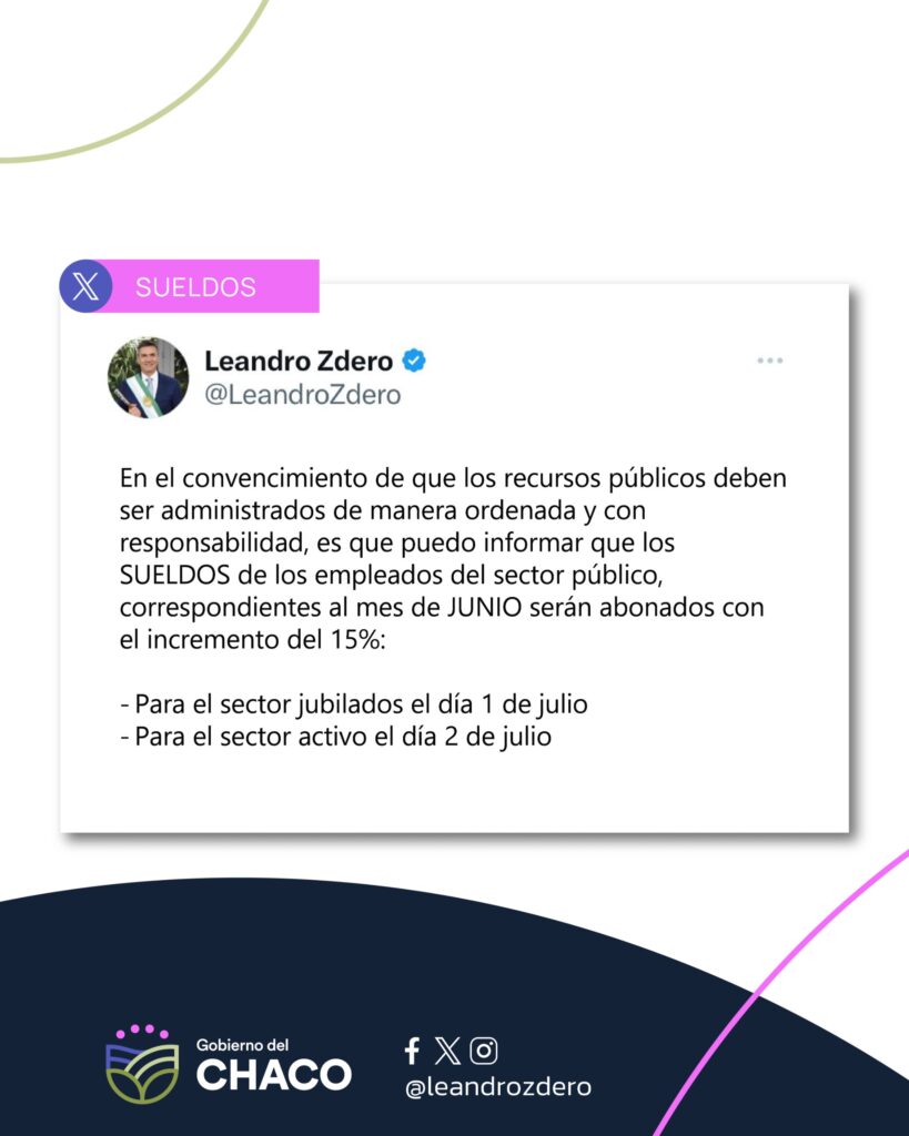 A través de redes sociales el gobernador de Chaco Leandro Zdero comunicado el pago de haberes correspondiente al mes de junio para sector Pasivo y activo de la administración pública provincial.