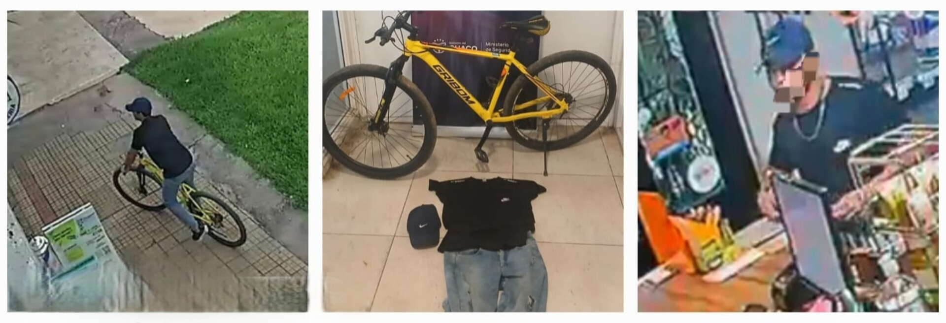 Bajo las directivas del Subcomisario Juan Marcelo Gómez, el Servicio Externo de la unidad analizó las grabaciones de seguridad. El relevamiento permitió identificar al autor y vincularlo con un segundo hecho ocurrido horas antes: el robo de una bicicleta mountain bike blanca en un supermercado de la avenida Hernandarias al 400.