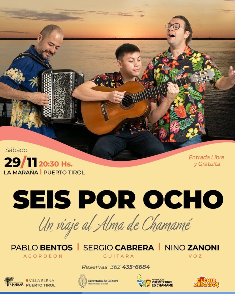 Luego, a partir de las 20:30 horas, tendrá lugar un concierto del trío “Seis Por ocho” integrado por el acordeonista Pablo Bentos, el guitarrista Sergio Cabrera y el cantante holando-correntino Nino Zanoni.
