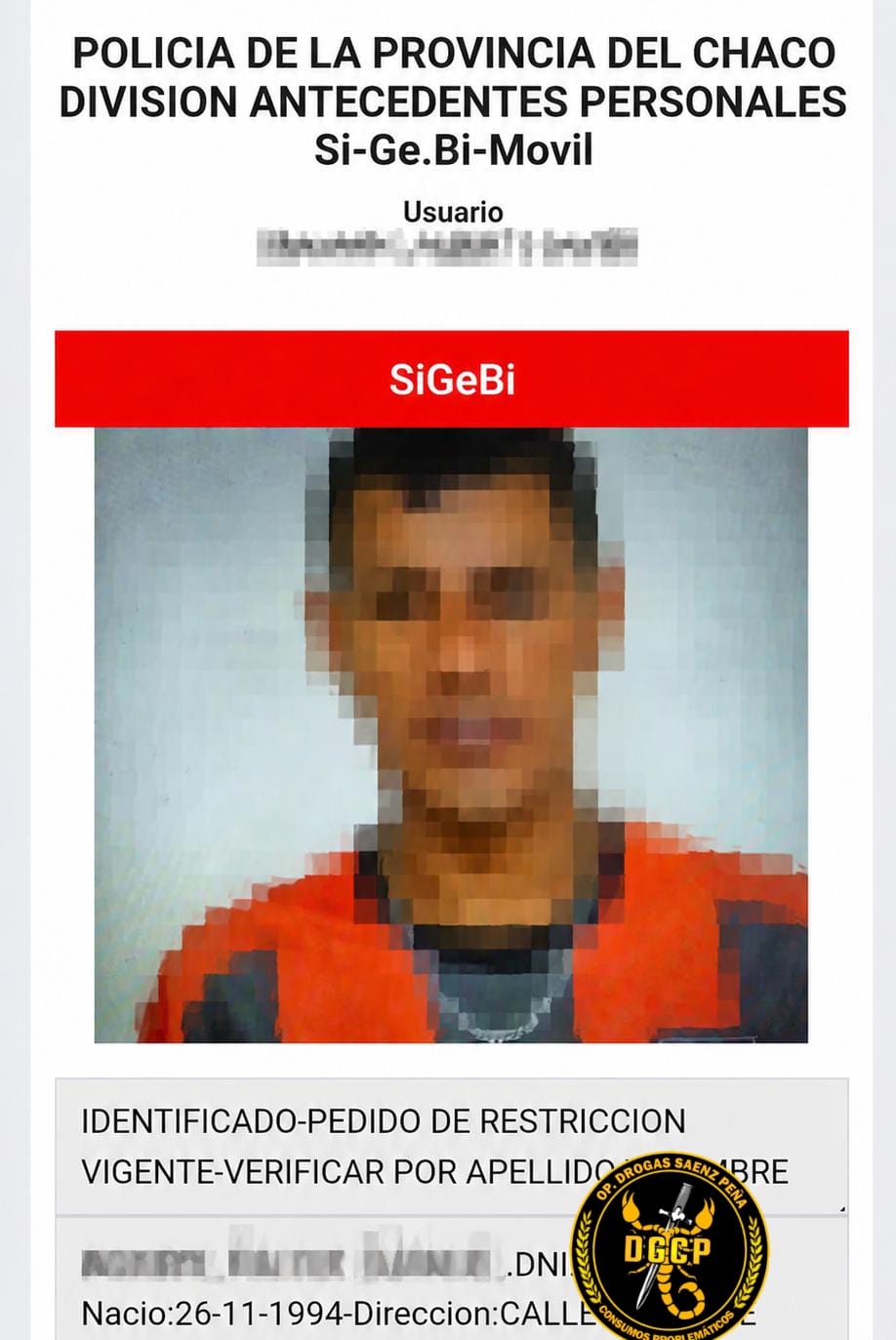 El procedimiento tuvo lugar en la zona de calle 25 de Mayo al 300, mientras los efectivos realizaban recorridas preventivas y controles de rutina en la jurisdicción. Tras identificar al individuo, oriundo de Machagai, los agentes consultaron sus datos en el sistema de gestión biométrica (SiGeBi), el cual arrojó un reporte de captura vigente.