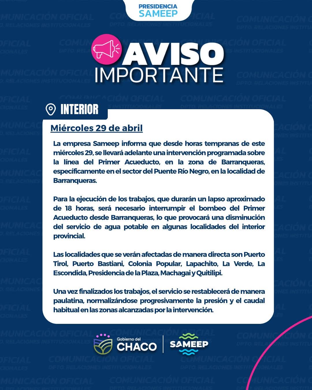 La empresa estatal SAMEEP informó que este miércoles 29 de abril se llevará adelante una intervención técnica en la zona de Barranqueras. Los trabajos durarán 18 horas y afectarán el suministro en varias localidades del interior provincial.